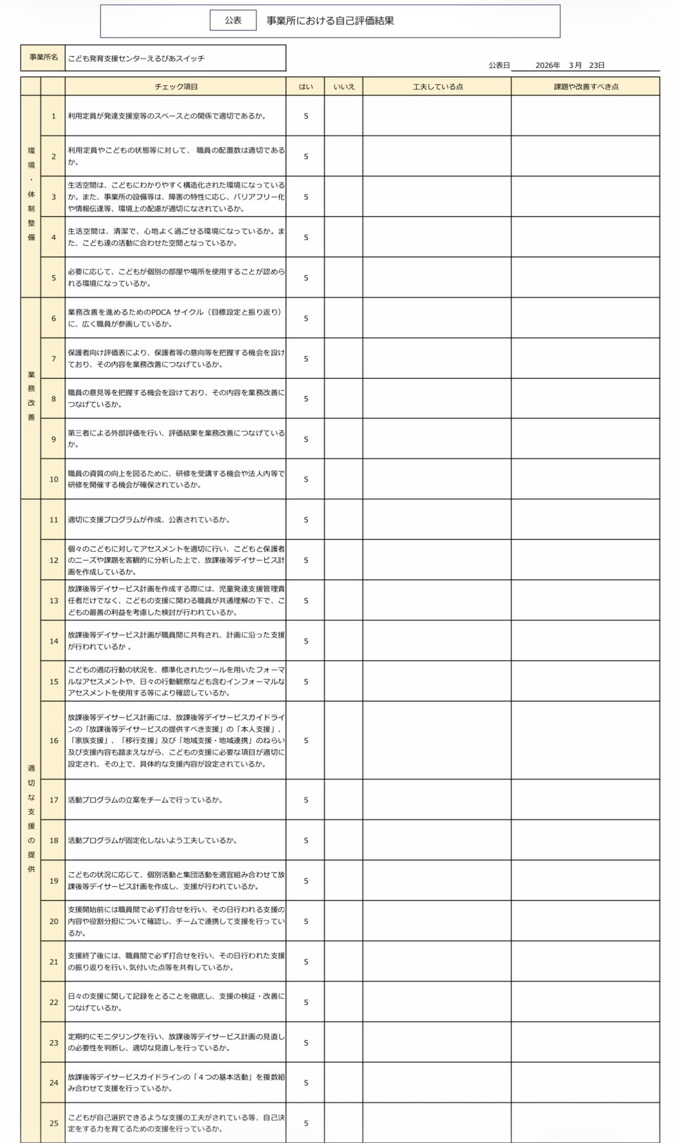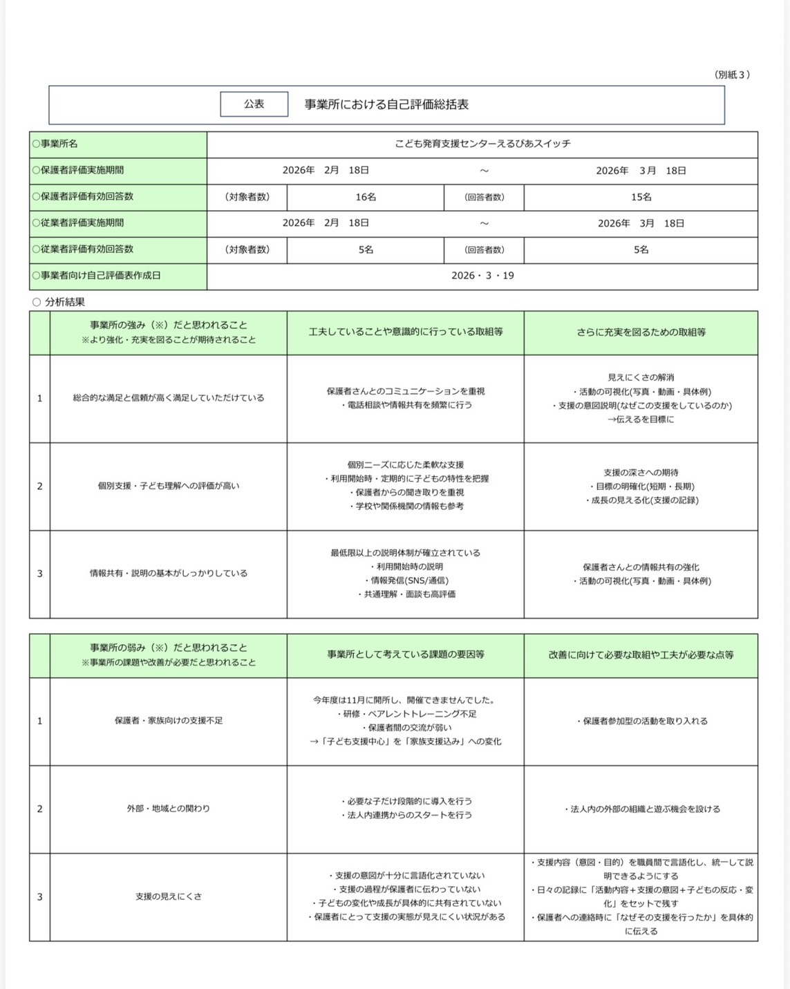 保護者の皆様ご協力ありがとうございました。今回の結果をもとに、さらなる良い事業所を目指し取り組んでまいります。よろしくお願いいたします。